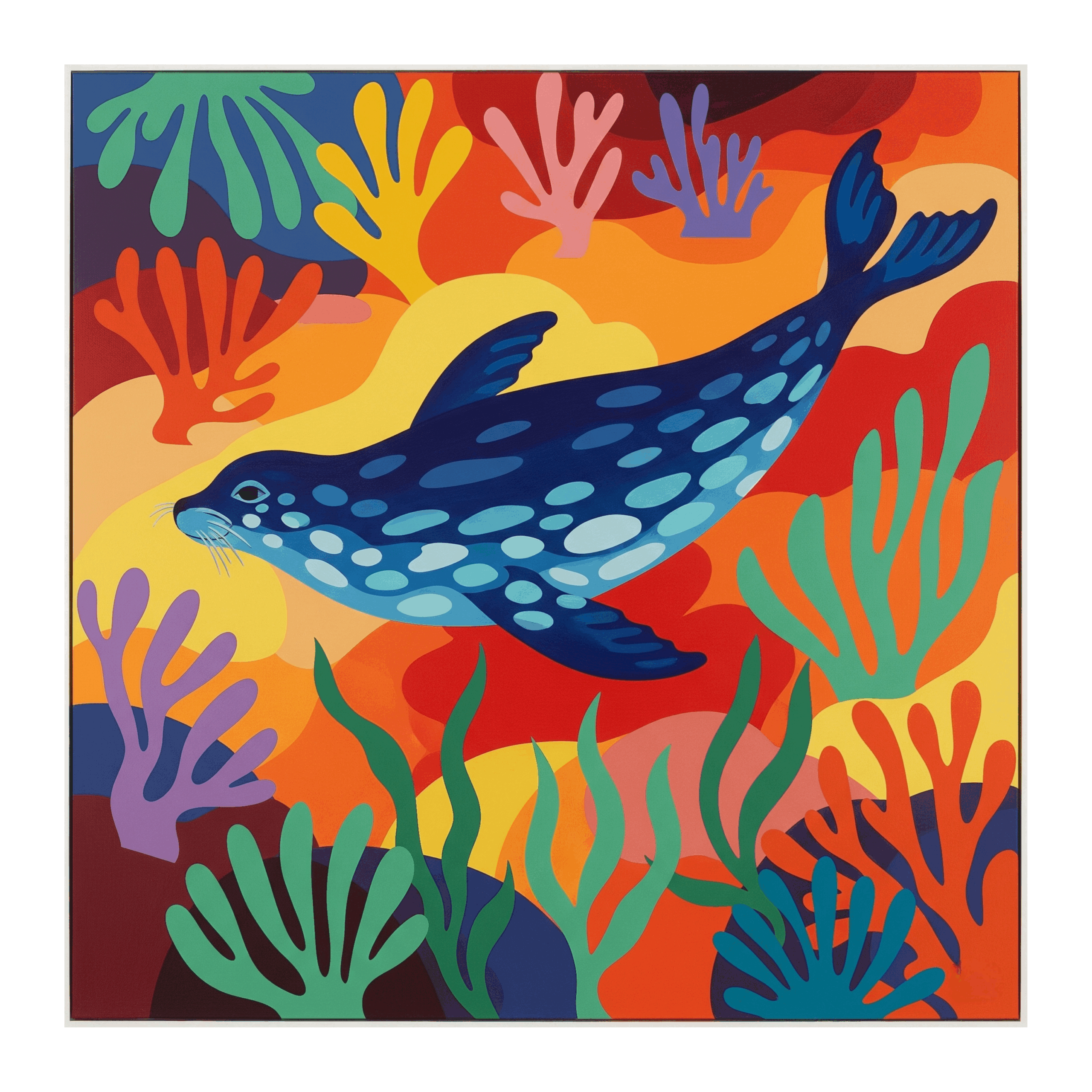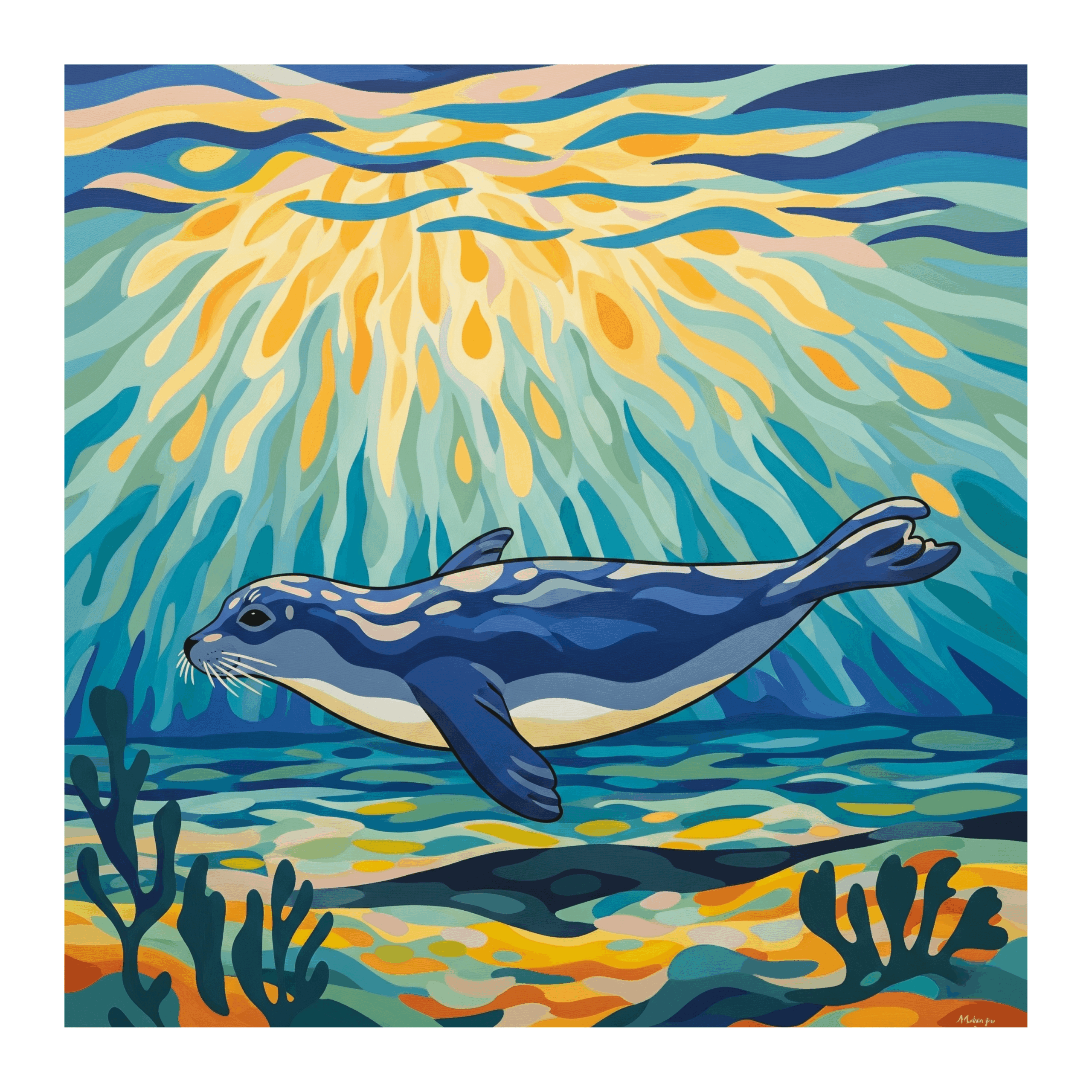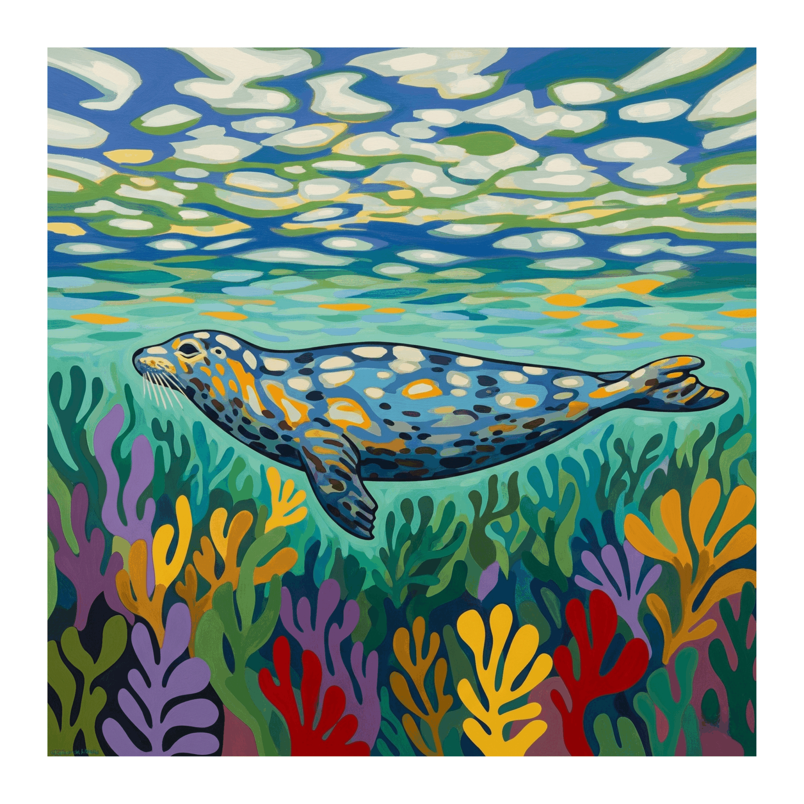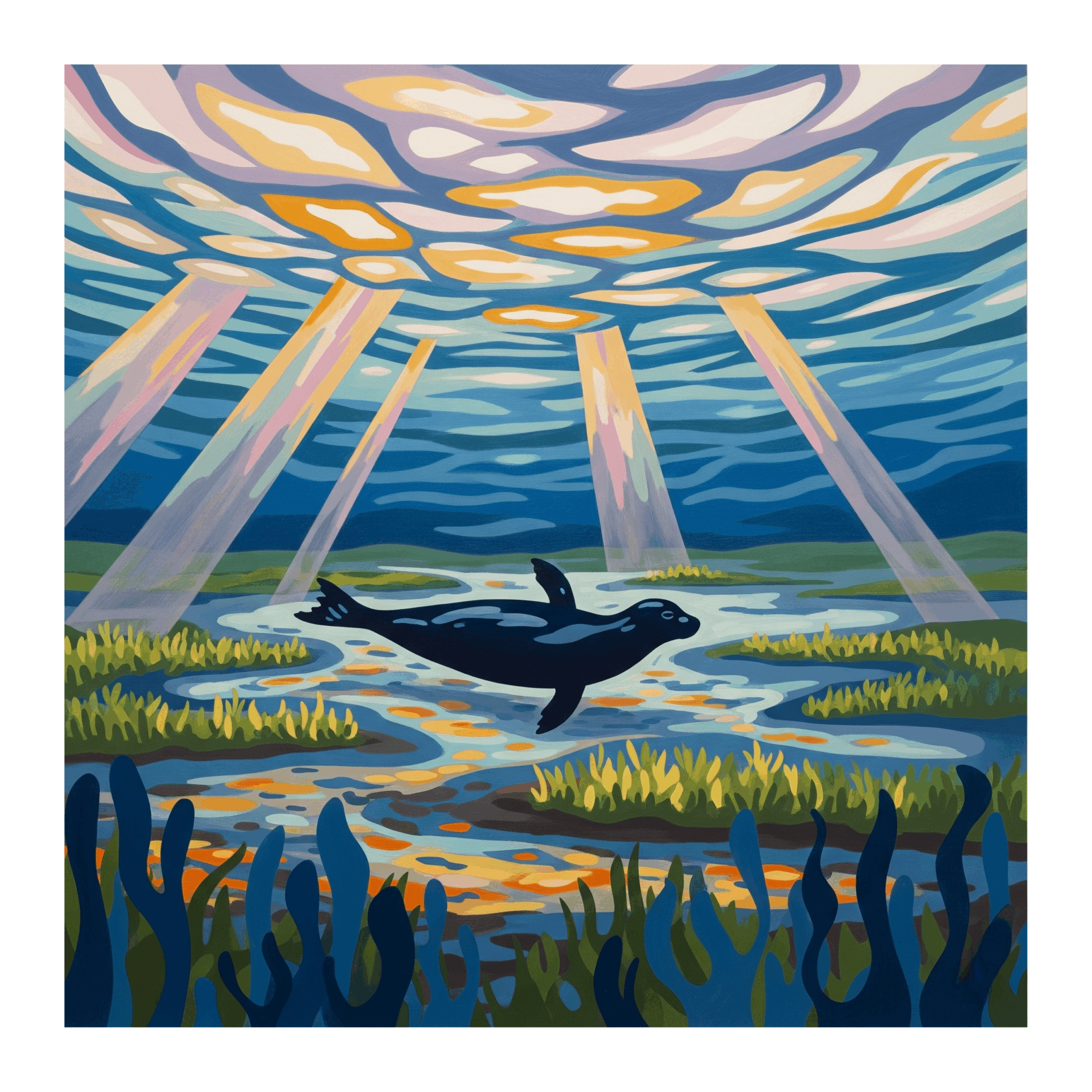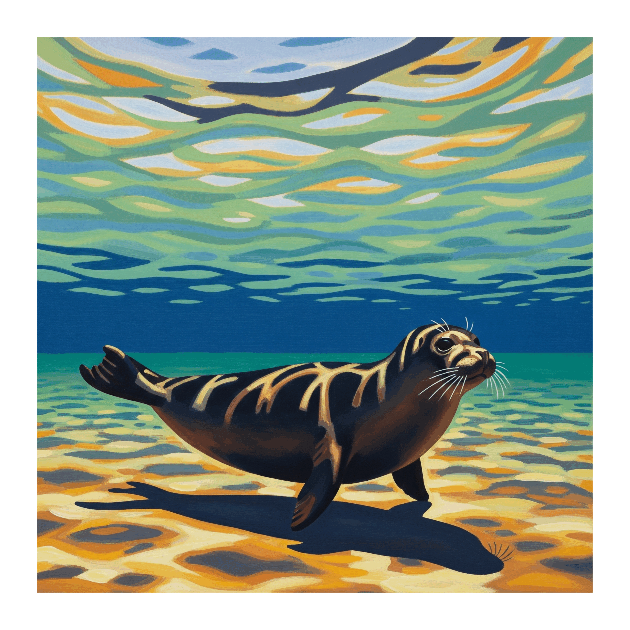 Een indrukwekkende weergave van zeehonden op de zandbanken, rustend tijdens laagwater. Uniek kunstwerkje op dibond plaatje.
